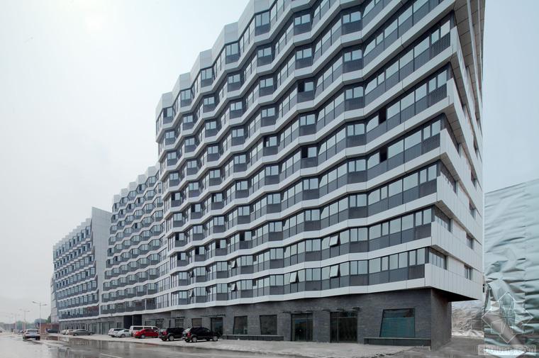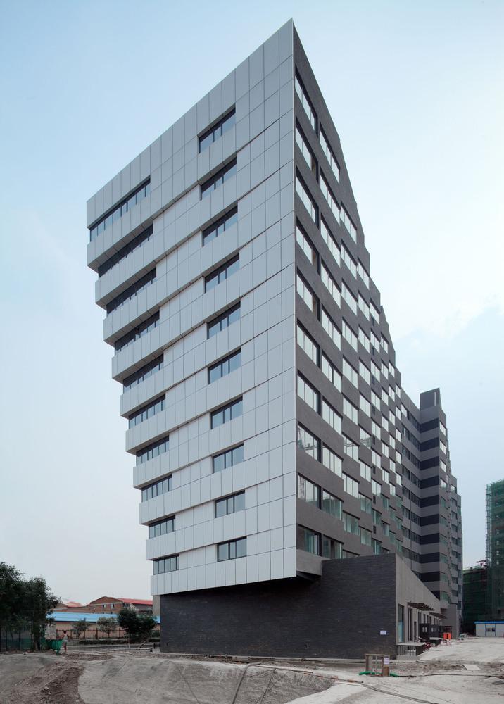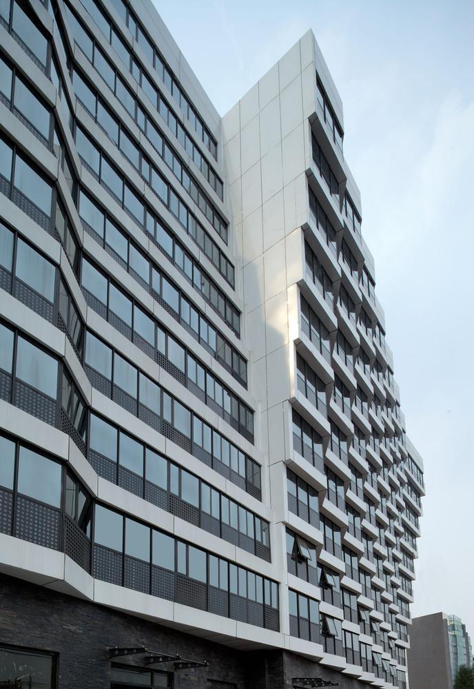 建筑的底層是展廳和商業(yè)。公寓部分在二層以上,大約占總建筑面積的三分之二,因分屬于三個投資人,業(yè)主希望從形式上有區(qū)分,突出各自的獨(dú)立性。我們以公寓面寬為基準(zhǔn)定義出一個標(biāo)準(zhǔn)戶型的外觀形式,在南立面上進(jìn)行重復(fù),通過基本單元有序的懸挑形成錯動,發(fā)展出水平和垂直方向富有動感的體量變化,進(jìn)而強(qiáng)調(diào)出辦公和兩部分公寓的清晰分界。于是集合體明確地呈現(xiàn)出四部分,一個底座和上面三個起伏的體塊,為內(nèi)容的不同提供了明顯的標(biāo)識。